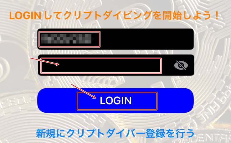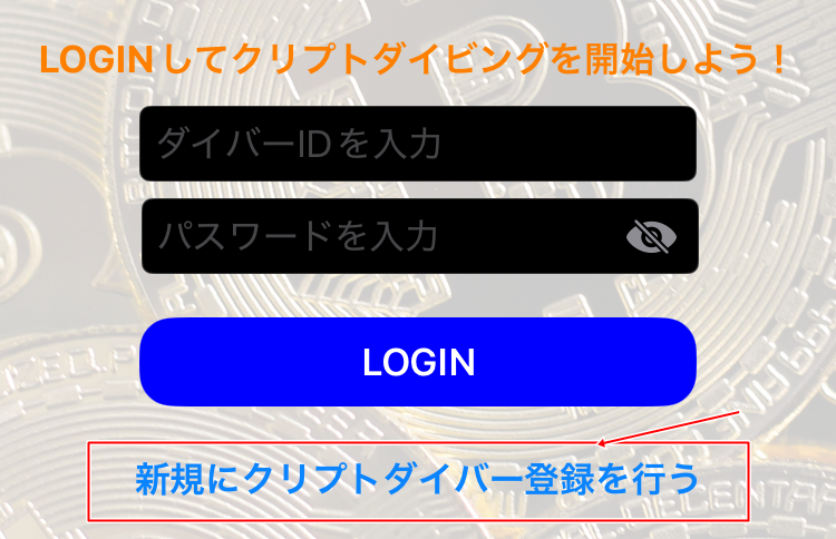 ログイン画面では初回なので「新規にクリプトダイバー登録を行う」をタップ