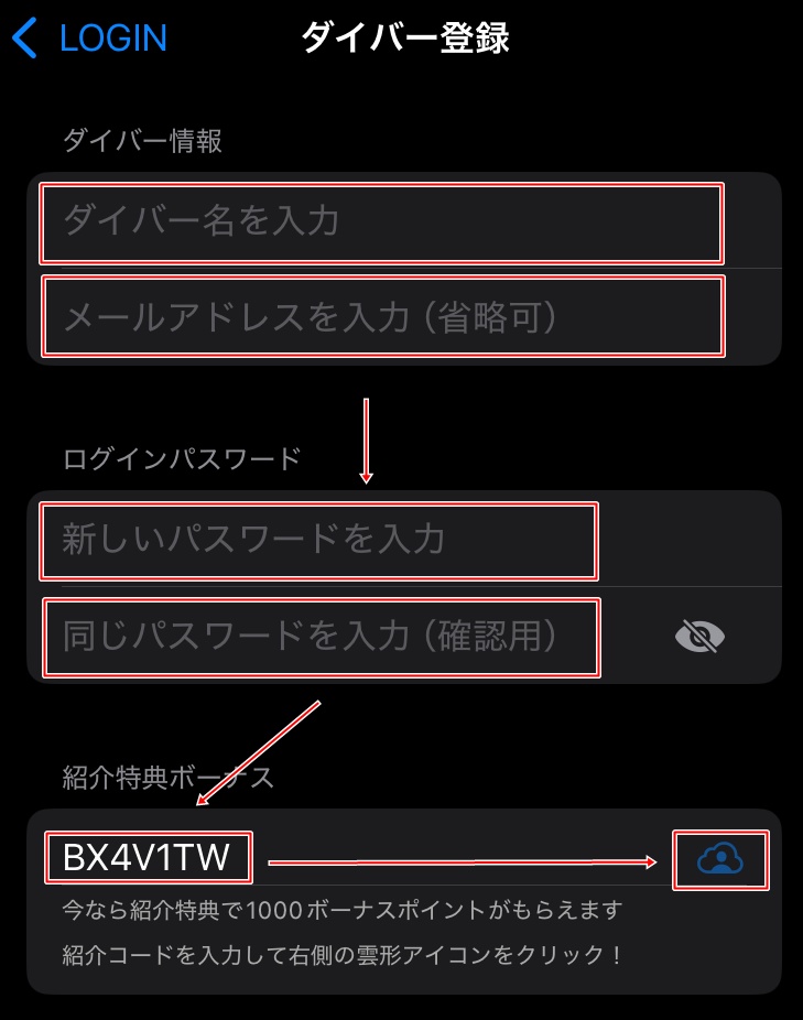 こちらからダウンロードいただくと、紹介コードが自動的に登録され、紹介特典としての1000ポイントと350枚のダイビングチケットが無料で登録された状態で始めることができます。